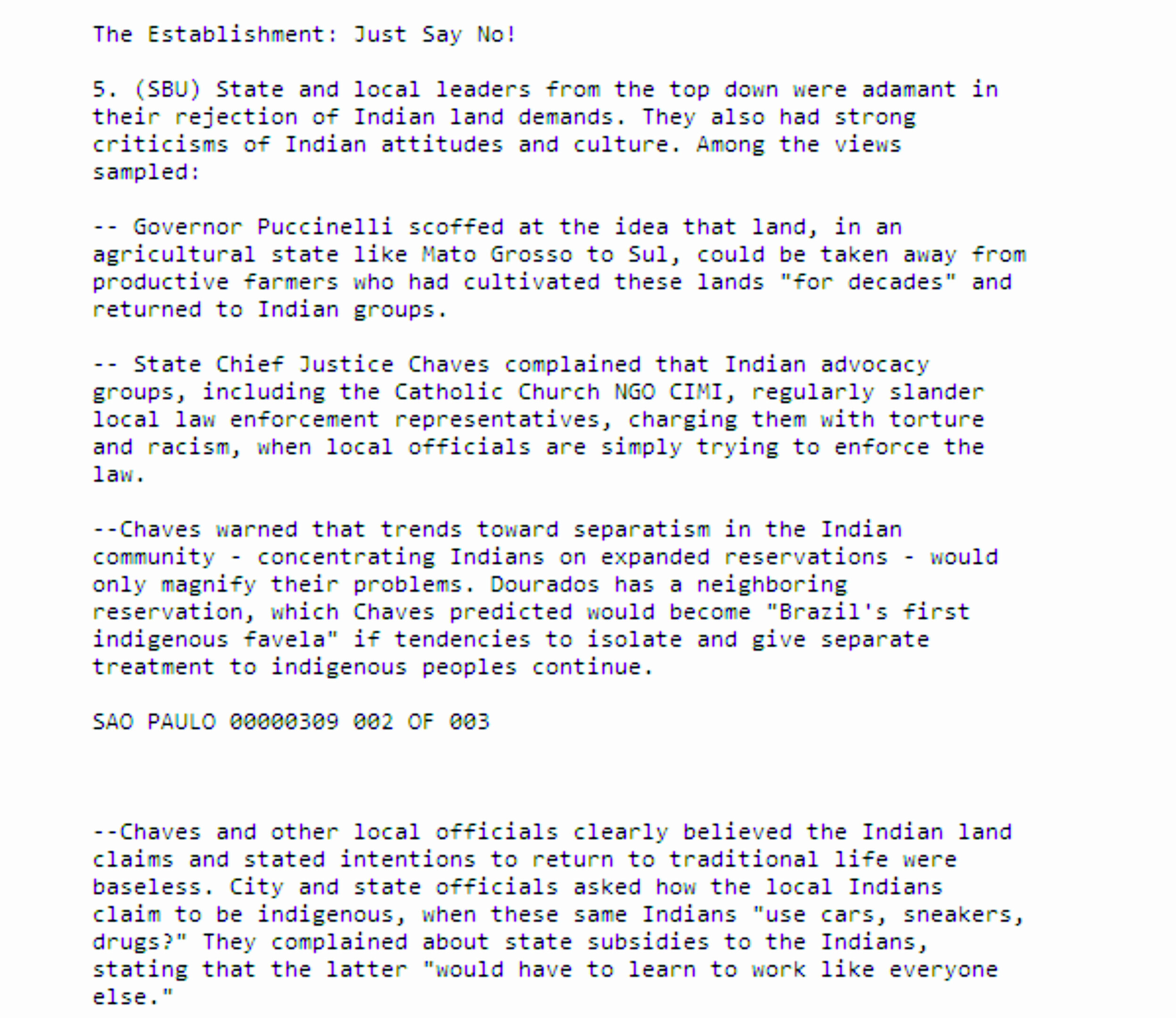 “Autoridades municipais e estaduais perguntaram como os índios dali reivindicavam ser índios, se eles ‘usam carros, tênis, drogas’. Eles reclamaram dos subsídios públicos dados aos índios, afirmando que eles deveriam ‘aprender a trabalhar como qualquer um’”, relata ainda o telegrama.