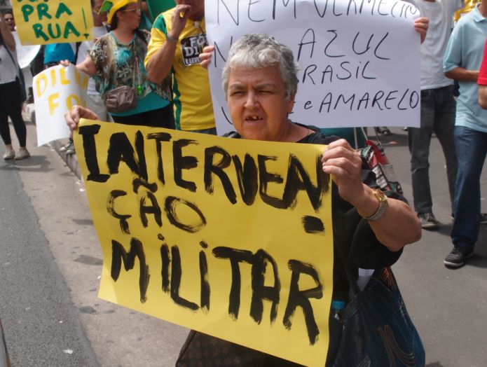 Um jovem de óculos escuros que vestia uma camiseta da banda de heavy metal Manowar estava mais inquieto. “Esse governo que está aí não dá. Ele precisa sair, nem que seja por intervenção militar”, disse. E quem deveria ser presidente, eu perguntei. “Eu acredito que Jair Bolsonaro representa uma alternativa realmente interessante. Afinal, ele foi um militar e é um político atuante”.